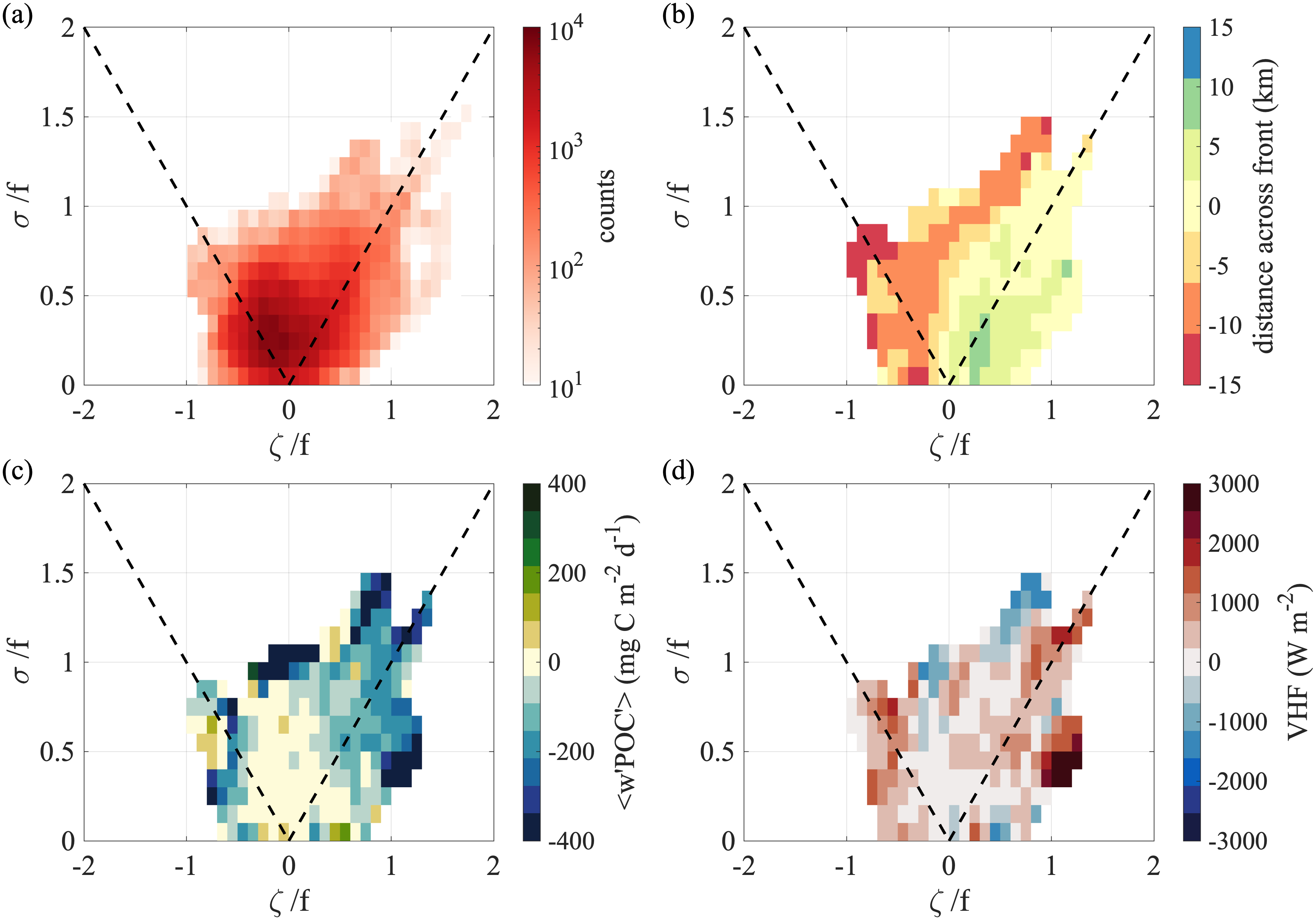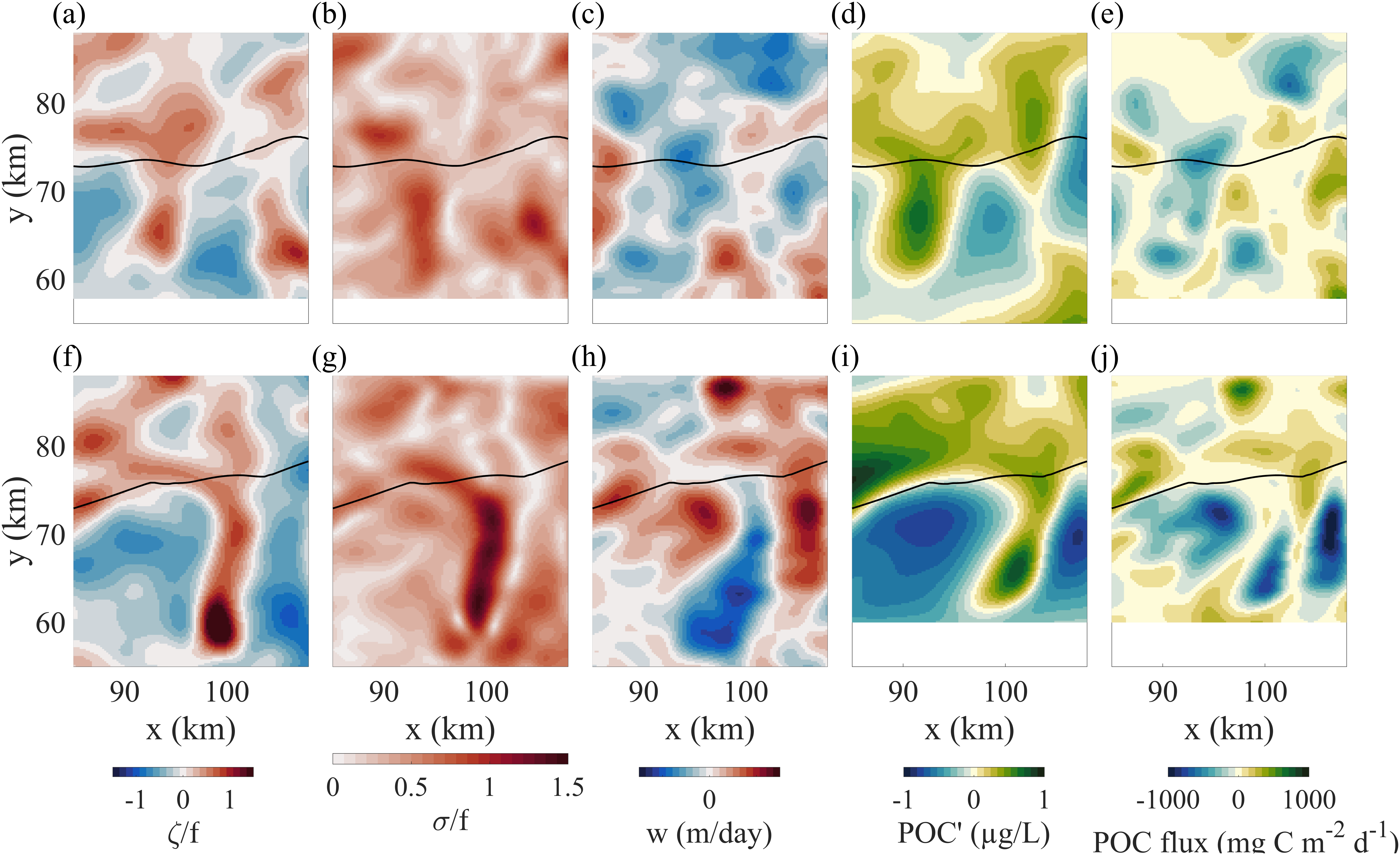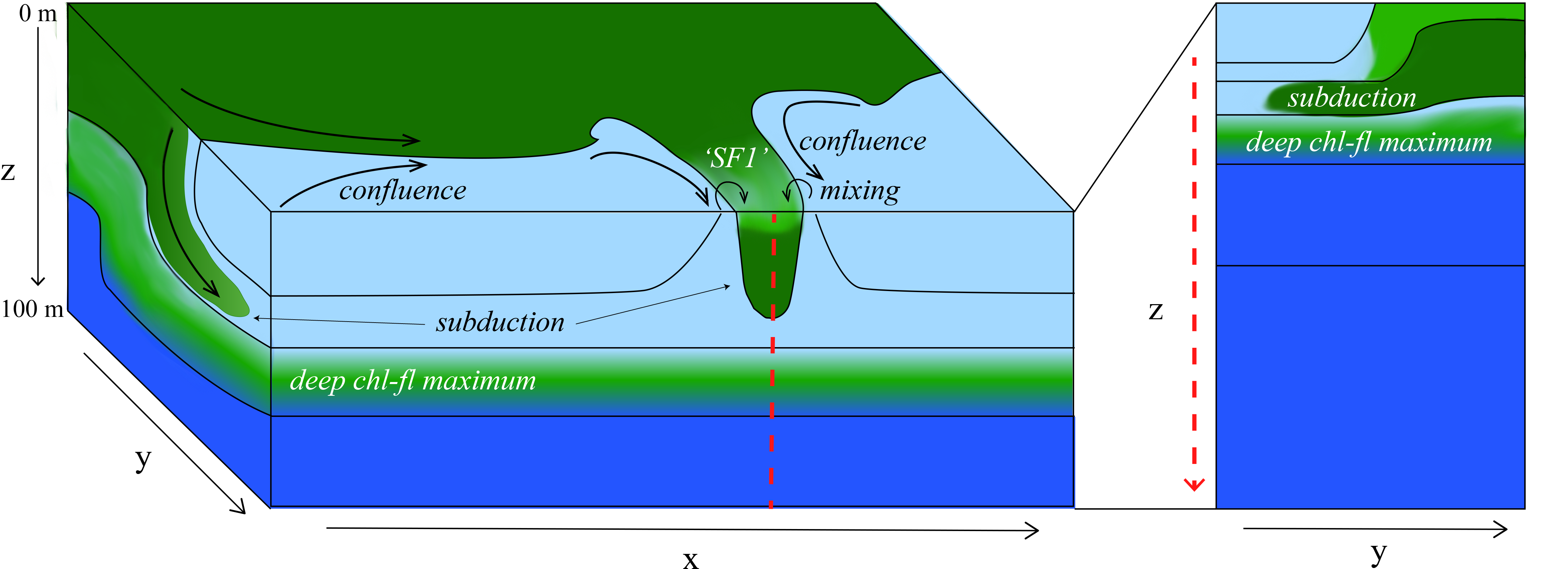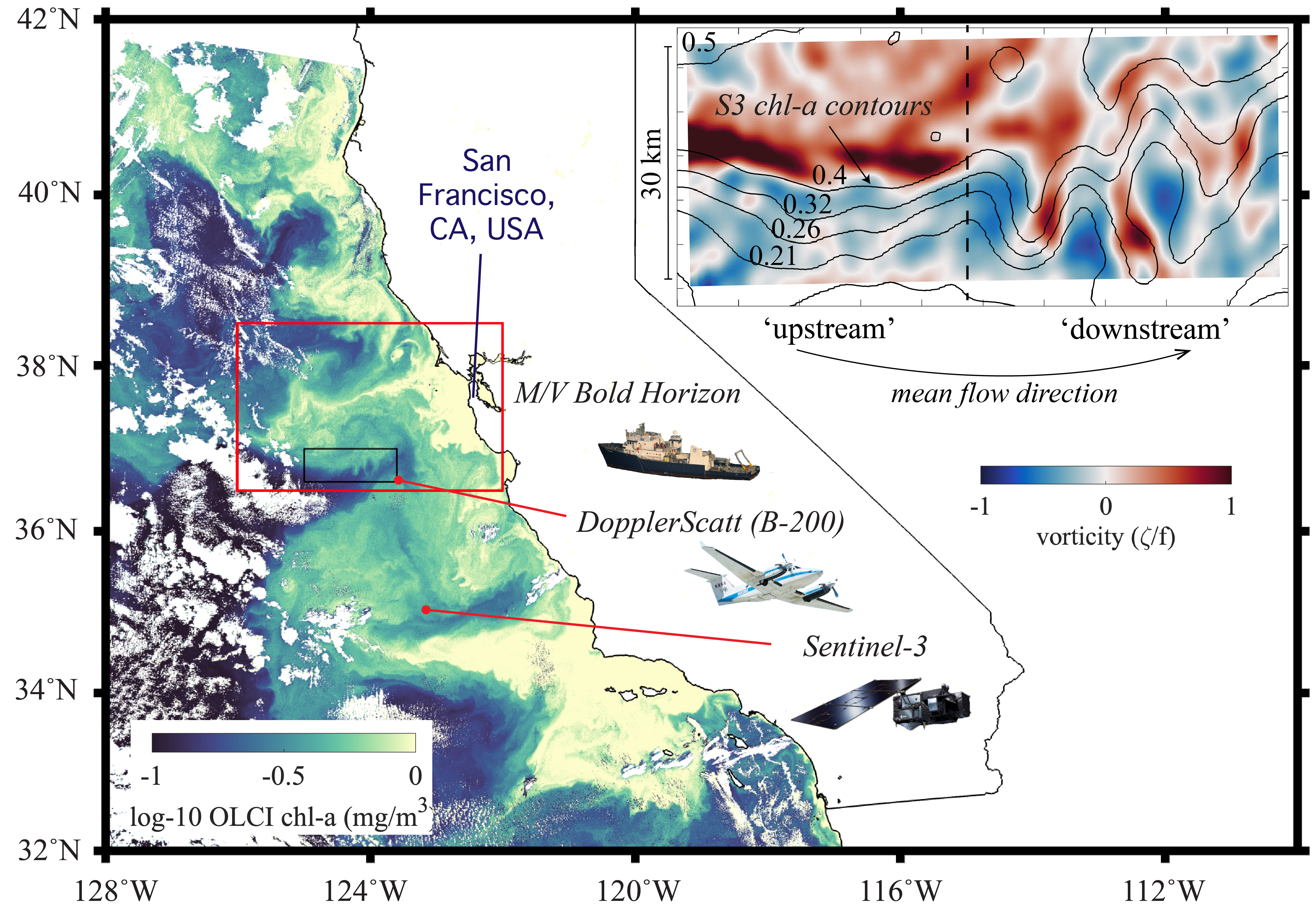Abstract: Modeling studies have shown that submesoscale (1-10 km) vertical velocities at fronts enhance the exchange of particulate organic carbon (POC) and heat between the surface ocean and depth. While POC and temperature can be readily assessed in situ, direct quantification of transport remain uncertain due to the observational challenges of measuring submesoscale vertical velocities in the upper ocean. NASA’s DopplerScatt is a novel airborne instrument that enables derivation of submesoscale vertical velocities from high resolution surface currents. Here, we provided novel estimates of eddy-driven subduction by pairing DopplerScatt-derived vertical velocities with POC estimates from satellite ocean color (Sentinel-3 OLCI) in a persistent upwelling frontal structure in the central California Current System. We documented the evolution of the frontal structure as it developed strong vertical velocities (O(100 m/day)) leading to a net POC flux of 30.6 ± 7.0 mg C m-2 day-1 downwards and a coincident upward vertical heat flux of 163.5 ± 36.0 W m-2 (estimated using Sentinel-3 SLSTR sea surface temperature). Downward POC flux was associated with upward vertical heat flux (R2 = 44%). Spatial distributions of fluxes, surface kinematics, and high resolution bio-optical and hydrographic profiles from the M/V Bold Horizon captured the underlying dynamics leading to vertical transport below the mixed layer. The front was characterized by two dynamical regimes, based on its characteristics in surface kinematics and frontal sharpness: ‘upstream’ and ‘downstream.’ In the earlier ‘upstream’ domain, where the front was sharper, large negative (positive) POC (vertical heat) fluxes occurred along the dense side of the front where positive vorticity and strain were enhanced. Here, vertical fluxes were associated along-isopycnal transport below the mixed layer induced by frontal overturning. The later stage of frontal evolution represented by the ‘downstream’ domain had patchier spatial distributions of fluxes enhanced in filaments and instabilities. One such filament developed strong positive vorticity, strain, and vertical velocities on super-inertial time scales and subducted 1300 mg C m-2 day m-1 below the shallow mixed layer. By providing novel estimates of eddy-subduction fluxes and characterizing the associated frontal evolution, this study contributes to the understanding of how submesoscale processes modify carbon export in the highly productive California Current System. This measurement approach can be expanded to other regions to further understand the influence of eddy-driven subduction on the marine carbon cycle.