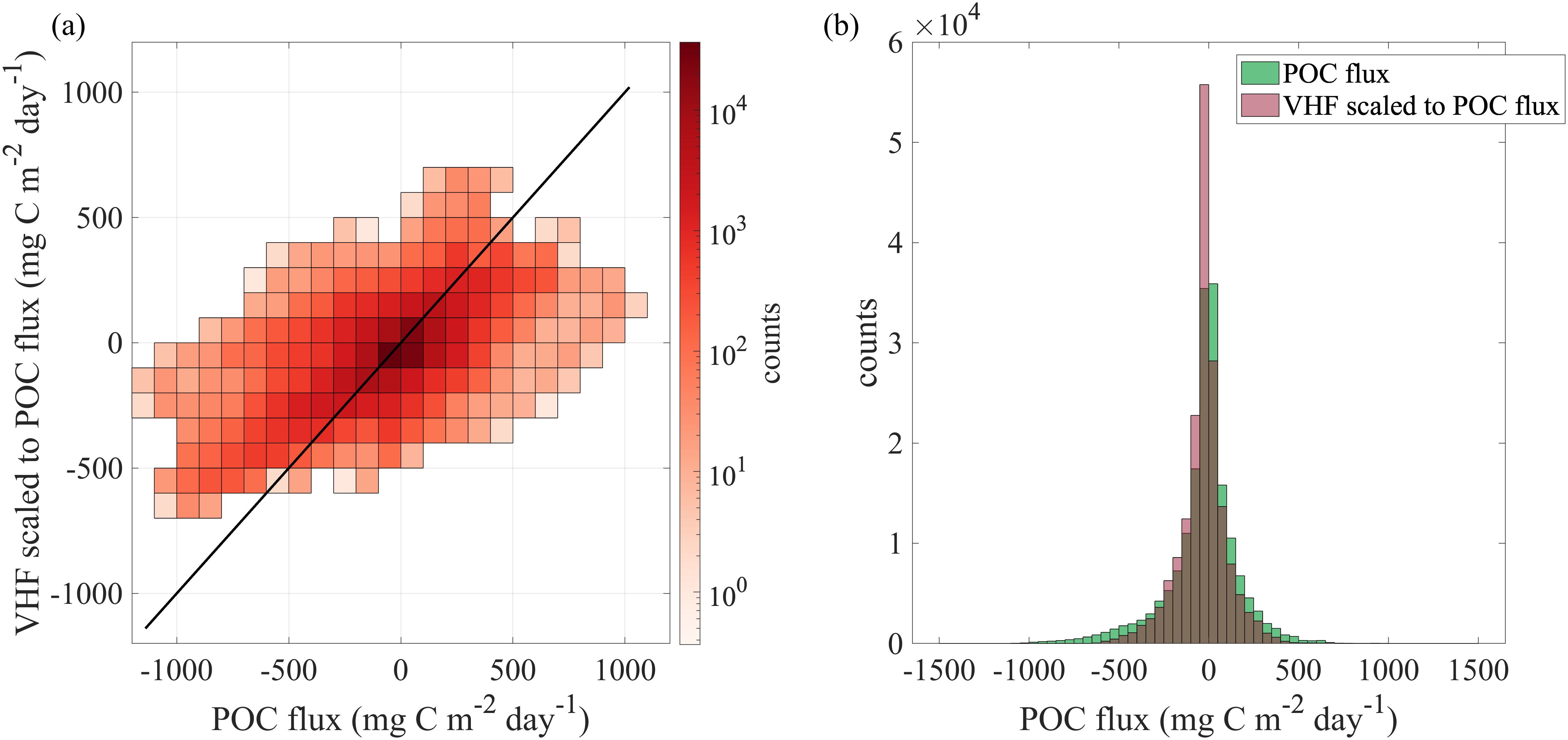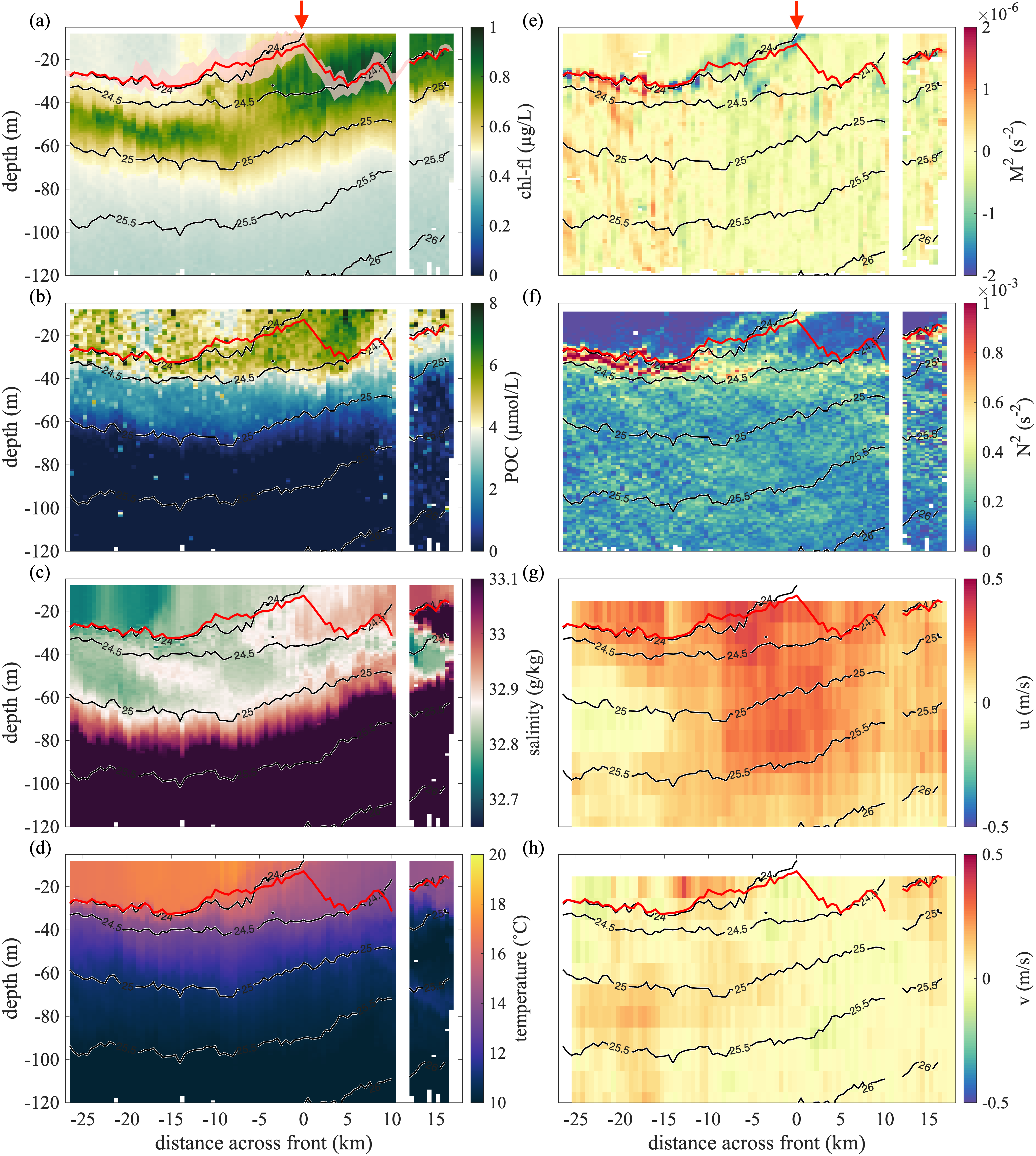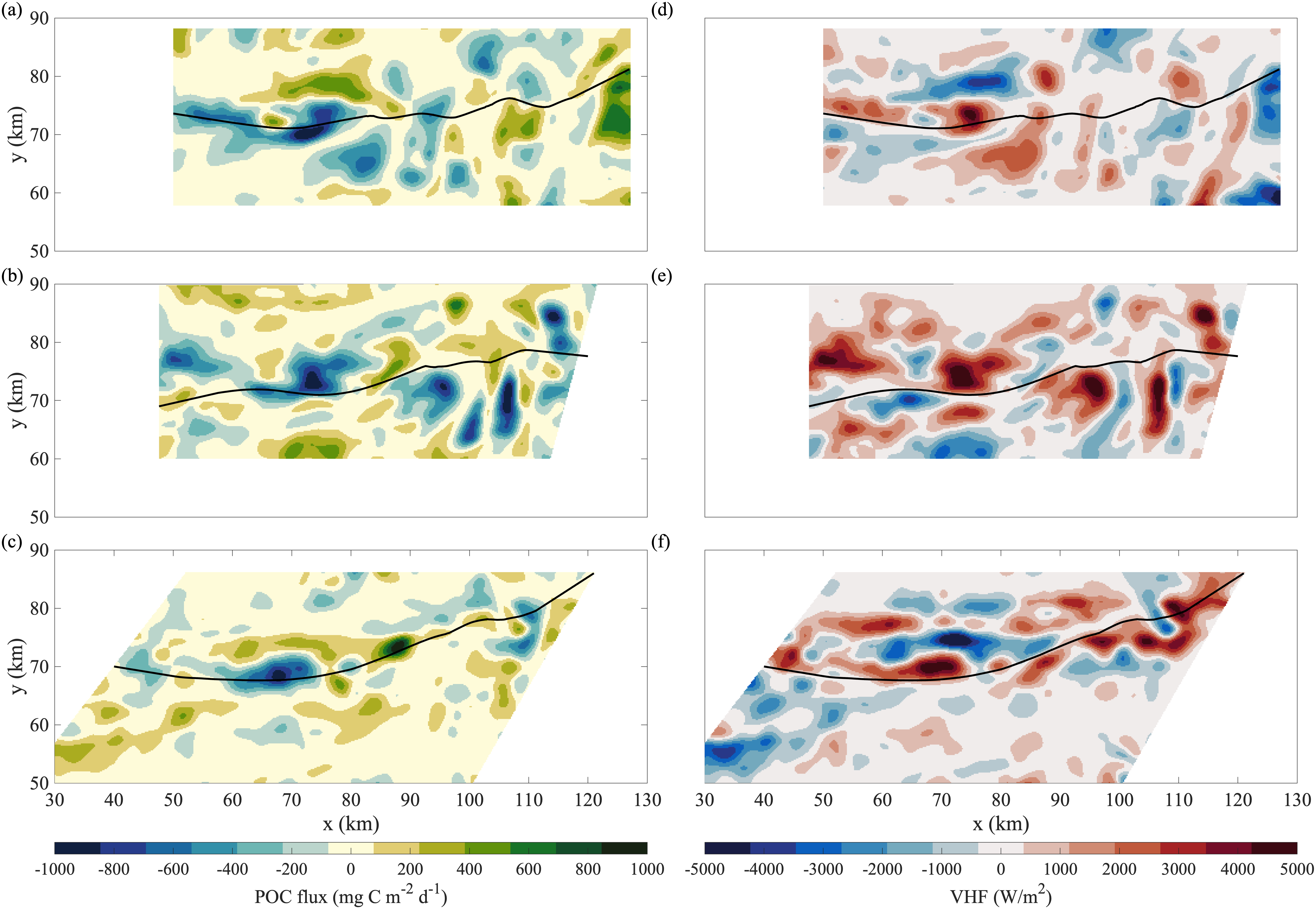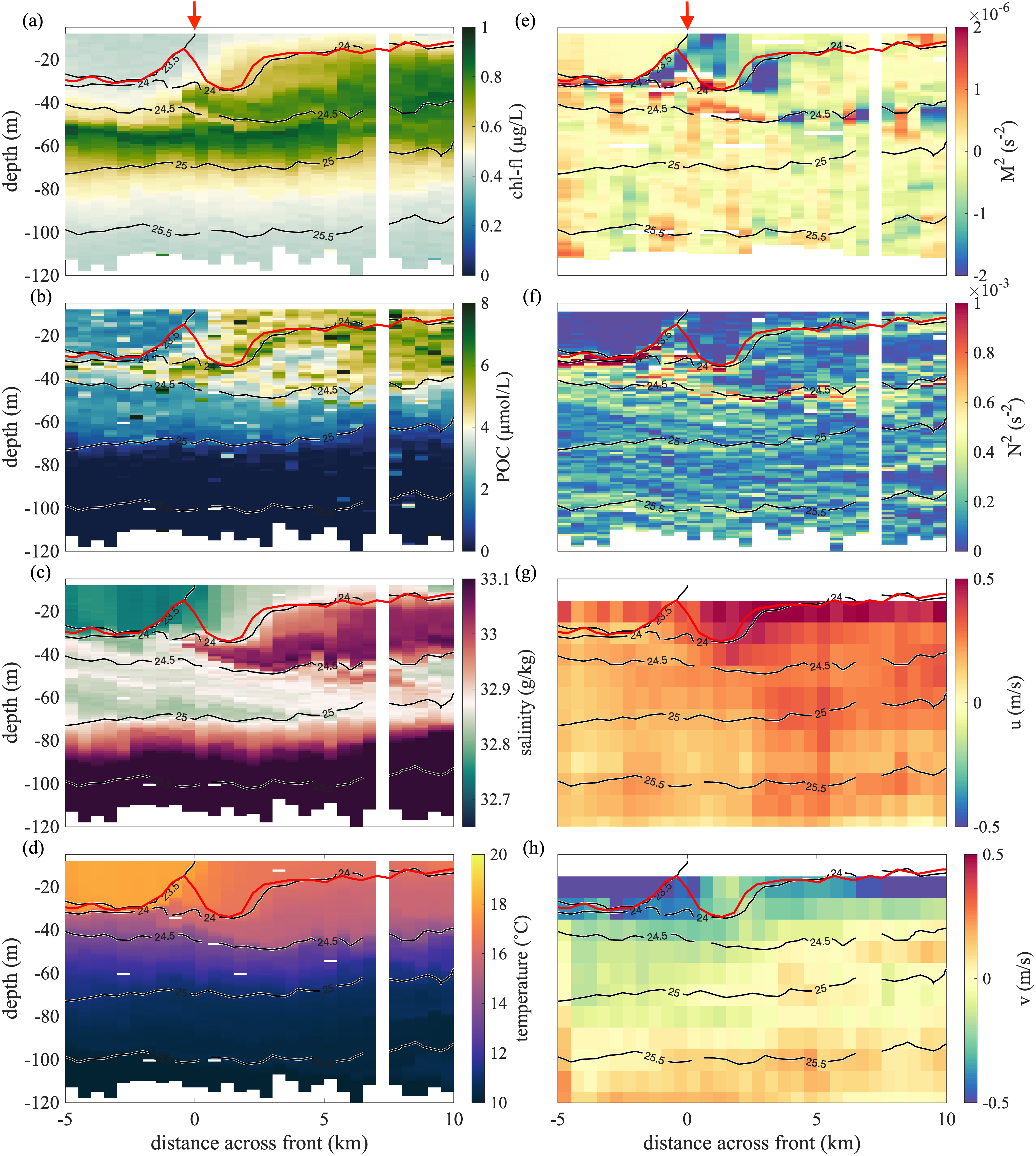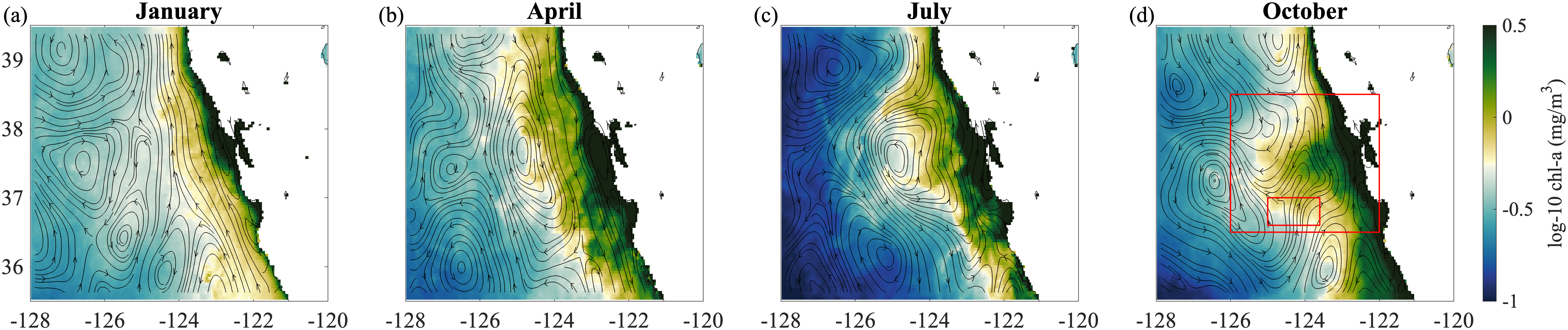 Abstract: Modeling studies have shown that submesoscale (1-10 km) vertical velocities at fronts enhance the exchange of particulate organic carbon (POC) and heat between the surface ocean and depth. While POC and temperature can be readily assessed in situ, direct quantification of transport remain uncertain due to the observational challenges of measuring submesoscale vertical velocities in the upper ocean. NASA’s DopplerScatt is a novel airborne instrument that enables derivation of submesoscale vertical velocities from high resolution surface currents. Here, we provided novel estimates of eddy-driven subduction by pairing DopplerScatt-derived vertical velocities with POC estimates from satellite ocean color (Sentinel-3 OLCI) in a persistent upwelling frontal structure in the central California Current System. We documented the evolution of the frontal structure as it developed strong vertical velocities (O(100 m/day)) leading to a net POC flux of 30.6 ± 7.0 mg C m-2 day-1 downwards and a coincident upward vertical heat flux of 163.5 ± 36.0 W m-2 (estimated using Sentinel-3 SLSTR sea surface temperature). Downward POC flux was associated with upward vertical heat flux (R2 = 44%). Spatial distributions of fluxes, surface kinematics, and high resolution bio-optical and hydrographic profiles from the M/V Bold Horizon captured the underlying dynamics leading to vertical transport below the mixed layer. The front was characterized by two dynamical regimes, based on its characteristics in surface kinematics and frontal sharpness: ‘upstream’ and ‘downstream.’ In the earlier ‘upstream’ domain, where the front was sharper, large negative (positive) POC (vertical heat) fluxes occurred along the dense side of the front where positive vorticity and strain were enhanced. Here, vertical fluxes were associated along-isopycnal transport below the mixed layer induced by frontal overturning. The later stage of frontal evolution represented by the ‘downstream’ domain had patchier spatial distributions of fluxes enhanced in filaments and instabilities. One such filament developed strong positive vorticity, strain, and vertical velocities on super-inertial time scales and subducted 1300 mg C m-2 day m-1 below the shallow mixed layer. By providing novel estimates of eddy-subduction fluxes and characterizing the associated frontal evolution, this study contributes to the understanding of how submesoscale processes modify carbon export in the highly productive California Current System. This measurement approach can be expanded to other regions to further understand the influence of eddy-driven subduction on the marine carbon cycle.